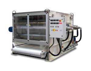 Cada tambor y la cinta de descarga del producto son accionados por motorreductores independientes. Estos accionamientos independientes facilitan el mantenimiento y ofrecen flexibilidad operativa. El jabón líquido o la suspensión de syndet se bombea sobre los rodillos, que la distribuyen uniformemente, formando una capa de 0,3 a 0,5 mm de espesor que se enfría y solidifica rápidamente. A continuación, las rasquetas raspan el producto de los rodillos en forma de escamas y éste cae sobre una cinta transportadora de descarga.